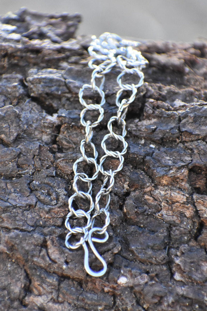 The Twisted Link Bracelet, measuring 9 inches, serves as an elegant standalone accessory or a versatile charm bracelet. Its twisted design offers a unique aesthetic and fun style.