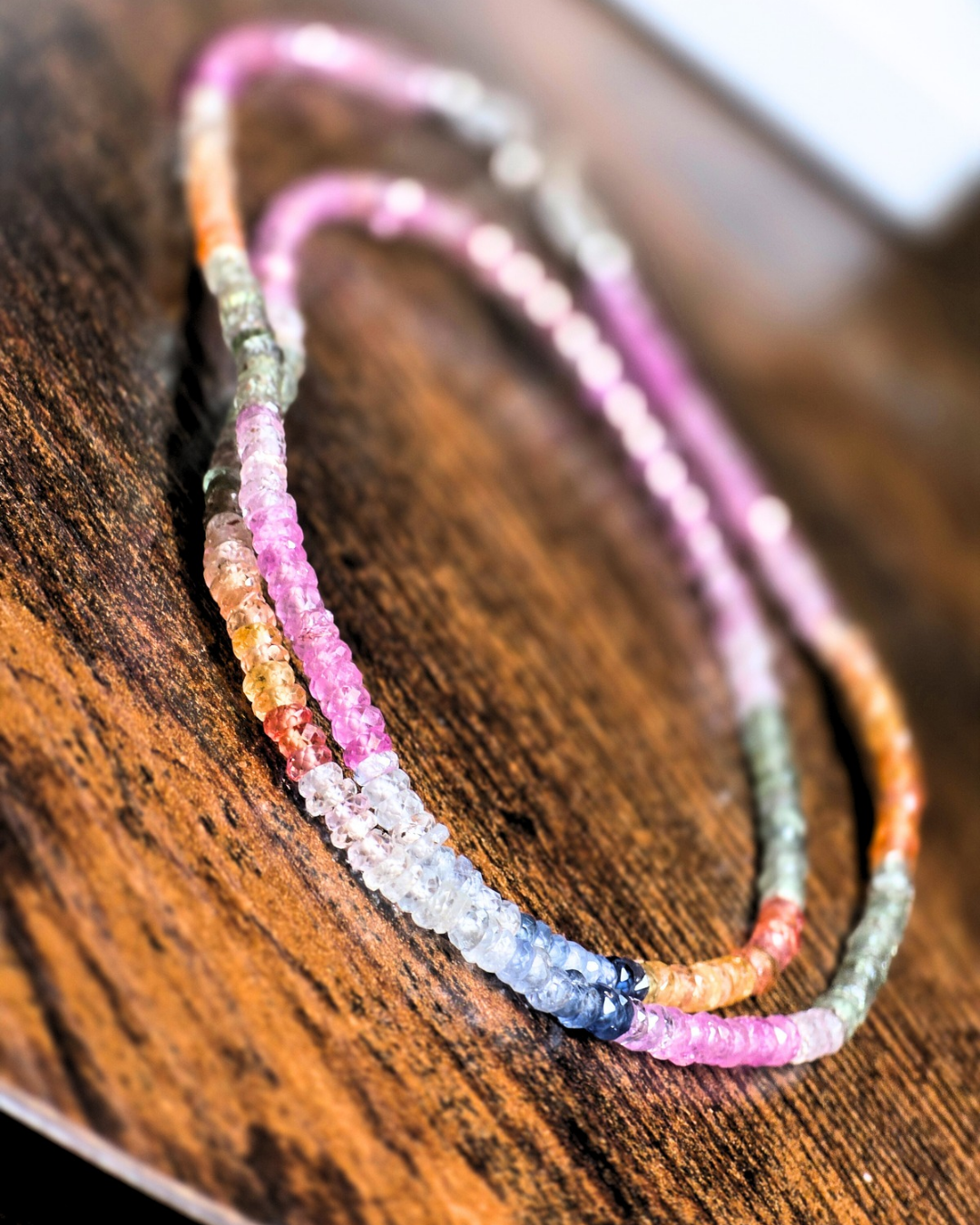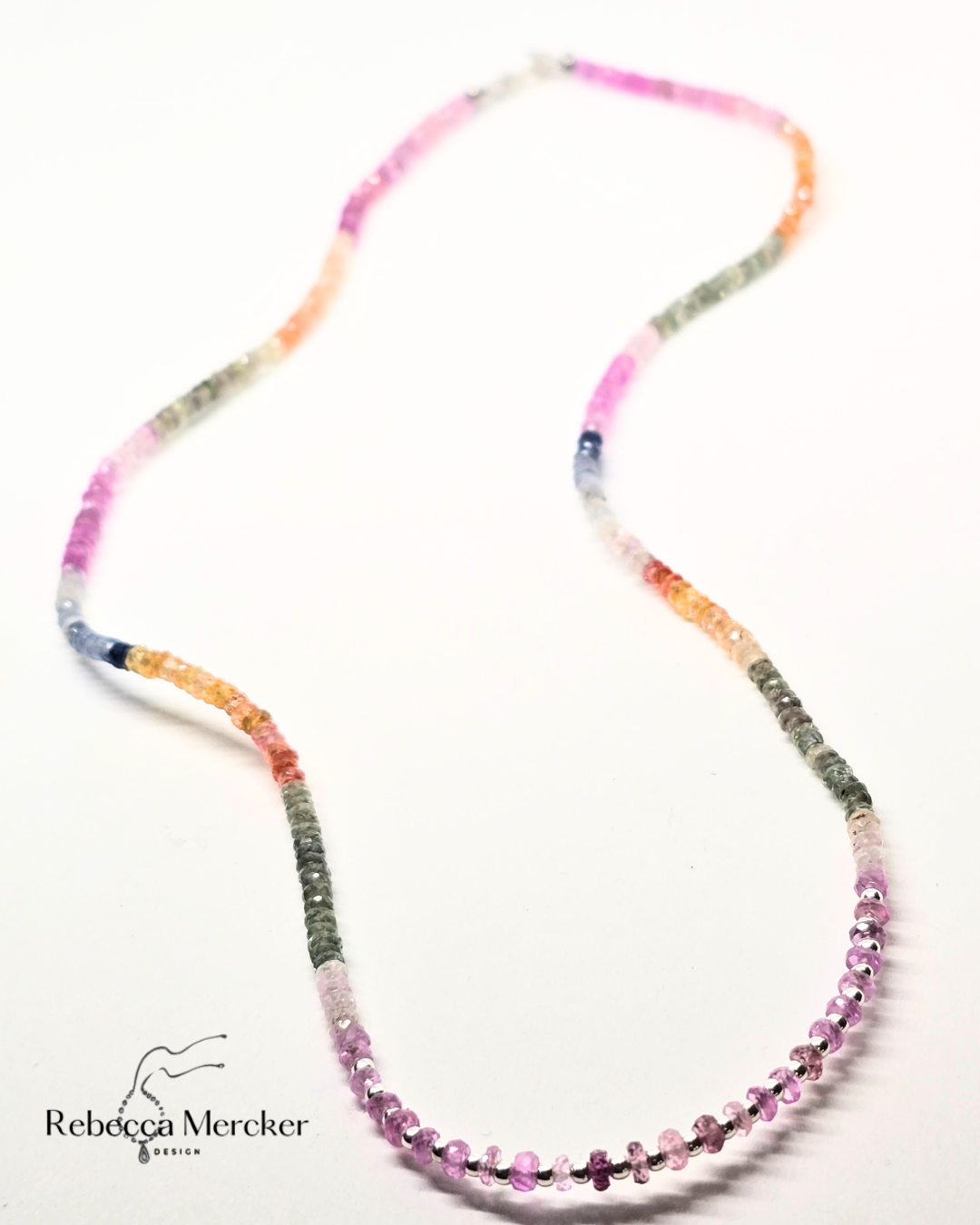 Expertly crafted, this 18-inch hand-strung necklace features a stunning display of Rainbow colors in blue, pink, green, yellow, and orange sapphires. Made with sterling silver accents and clasps, this piece is a true representation of natural beauty.