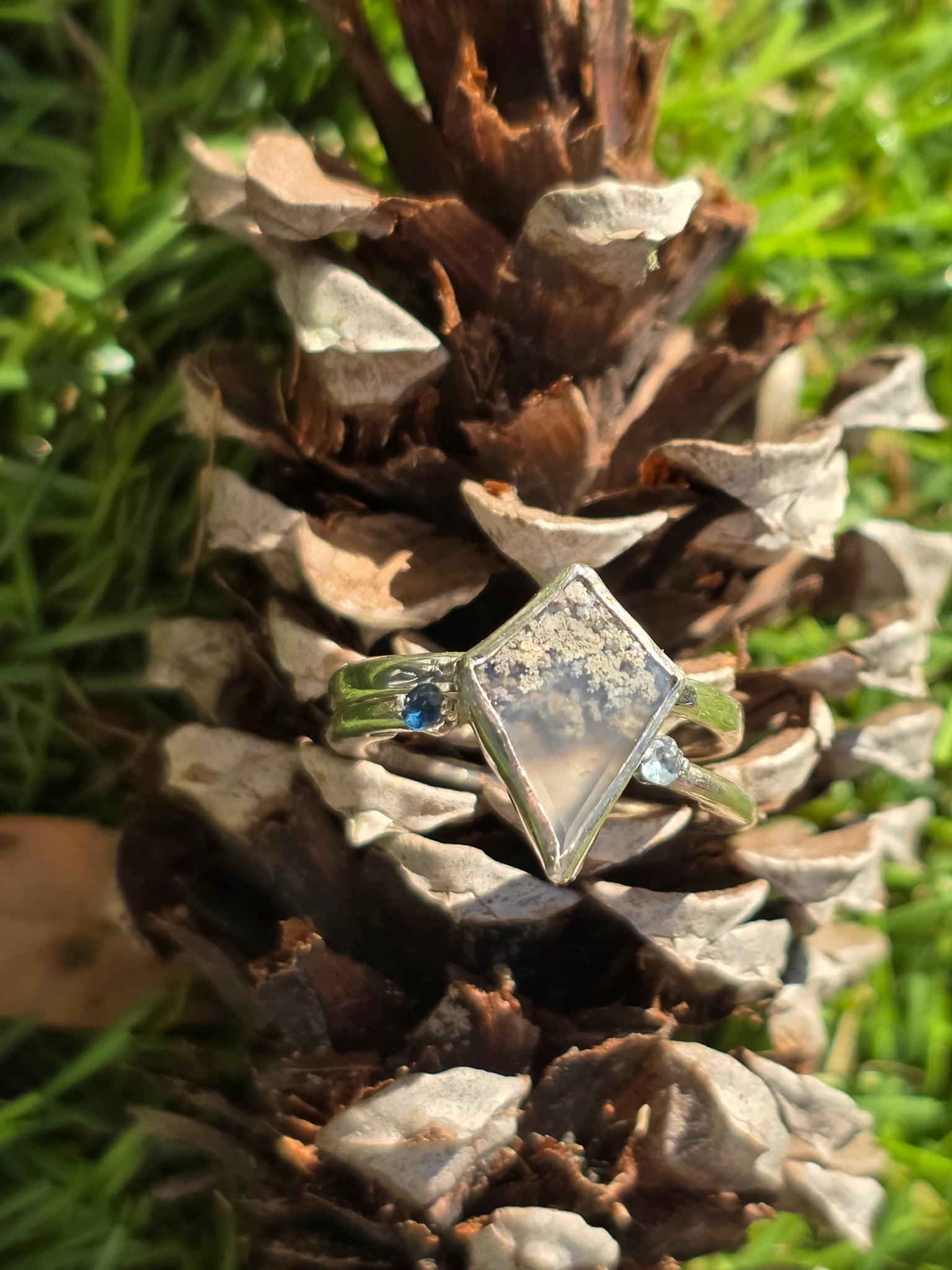 The main ring is a size 6 sterling silver band with a solitaire Moss Agate bezel set in the center.